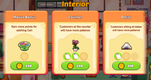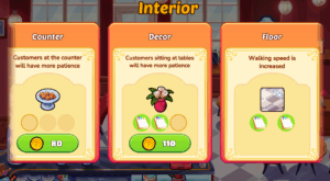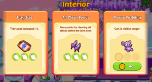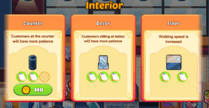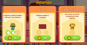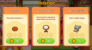 Use your hard-earned coins to purchase Interior Upgrades that enhance your dining spaces and boost your efficiency. There are three levels of each interior upgrade, increasing your efficiency even more! Interior Upgrades can: