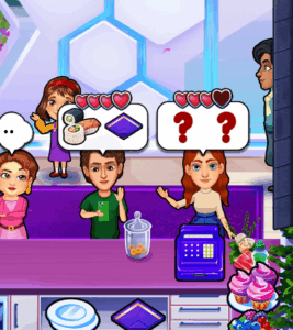 This customer is always changing her mind, so be quick — she might change her order if you take too long serving her! She has purple hearts, making her easy to spot.